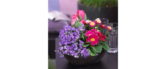 Ein Traum in romantischen Farben wird in einer modernen, schwarzen Schale zur Wirklichkeit: Tausendschön (Bellis perennis), Tulpen (Tulipa-Hybride) und Primeln (Primula vulgaris) in Pink werden im Kontrast zur blauen Glockenblumen (Campanula portenschlagiana) gesetzt.