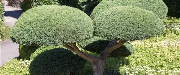 Immergrüne Pflanzen wie die Zwergformen von Koniferen, aber auch Buchs, Spindelsträucher oder Efeu stehen dem