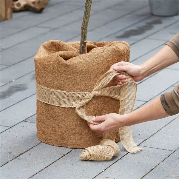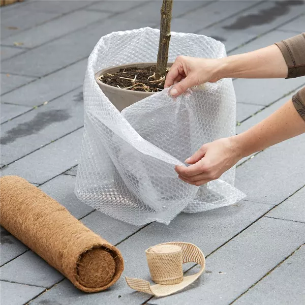 Kübelpflanzen, die im Winter nicht in Haus oder Garage umziehen, können durch verschiedene Maßnahmen, sogar durchaus dekorativ, verpackt werden – und somit über den Winter einen geschützten Platz vor der Haustür oder auf dem Balkon einnehmen. Sie können Kokosmatten oder Jute-Filz verwenden, um das Gefäß in einer ersten Schicht zu isolieren. Anschließend umwickeln Sie alles nochmals mit Rindenholz- oder Weidematten. Sehr ansprechend wirken Jute-Übertöpfe, die mit einem hübschen Band oder Kordel verknotet nicht nur schick aussehen, sondern auch entsprechend windgeschützt sind. Stellen Sie den Topf zusätzlich noch auf z.B. eine Styroporplatte, um ihn gegen Bodenfrost zu schützen. An frostfreien Tagen kann auch im Winter gegossen werden.