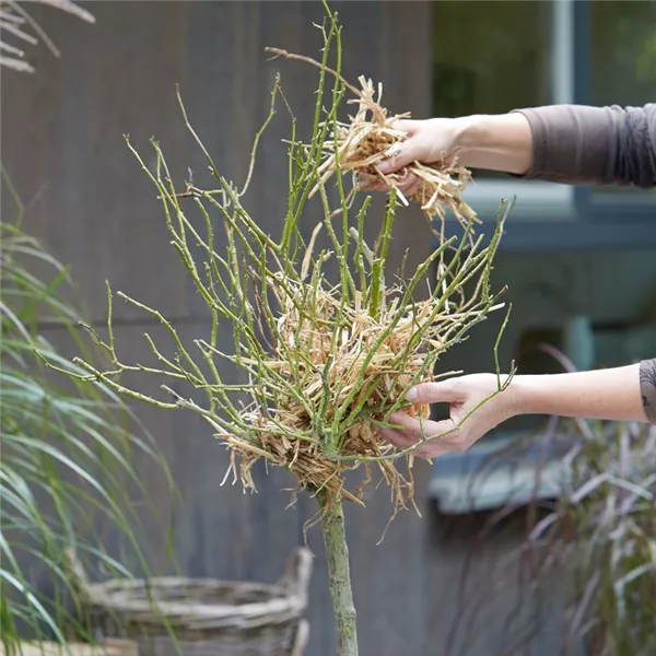 Rosen müssen im Bereich der frostempfindlichen Veredelungsstelle geschützt werden.